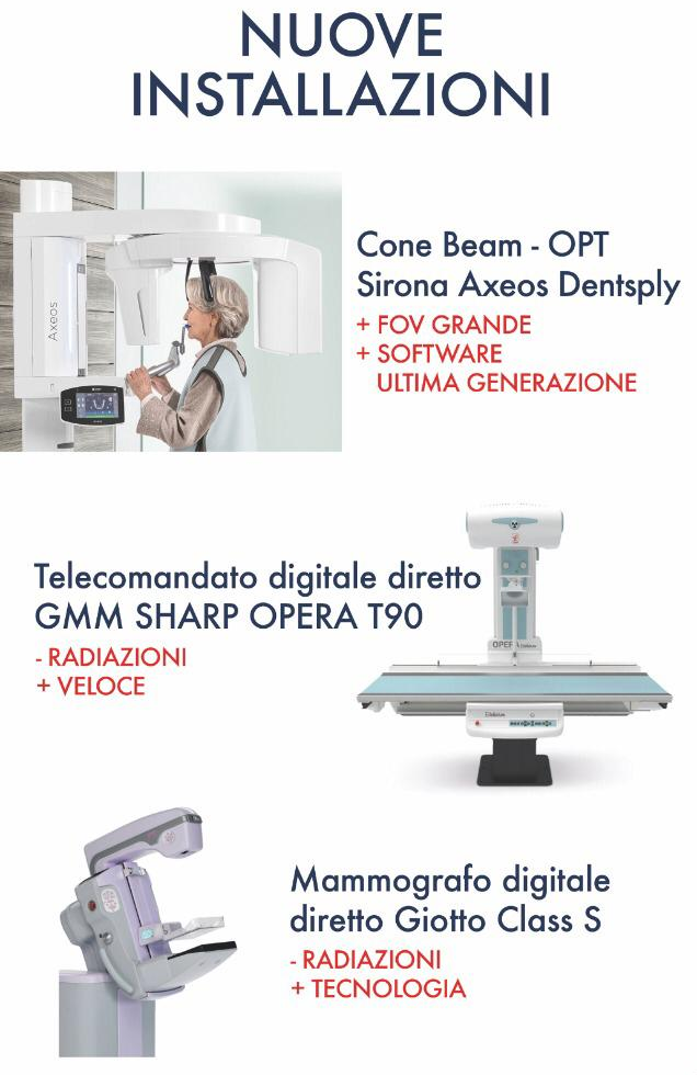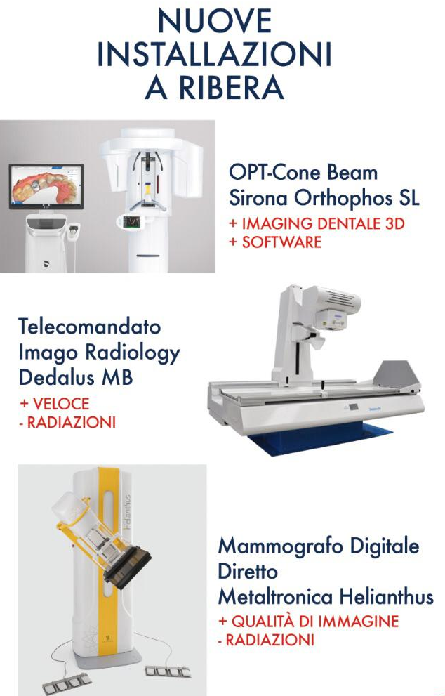 2020-2021: nuovo Telecomandato Digitale GMM SHARP Opera T90, nuovo mammografo digitale diretto Giotto Class S, nuova Cone Beam – OPT Sirona Axeos Dentsply, nuovo ecografo GE Logiq E10 (presso il centro di Ribera); nuova TC a 64 strati GE Revolution EVO;
